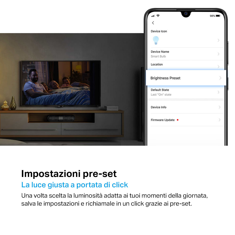 - ● Luce Smart Dimmerabile - Lampadina con luce calda 2700K, regola a tuo piacere la luminosità e crea l'atmosfera giusta per il tuo risveglio o una luce soft per accompagnare le tue serate, salvala sull'app Tapo e utilizza di nuovo la stessa impostazione quando lo desideri!