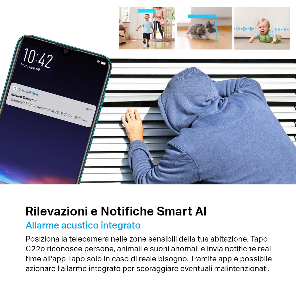 - ● Rilevamento e notifiche Smart AI - Sfrutta le tecnologie smart AI per effettuare un monitoraggio mirato e ricevere notifiche solo in caso di reale bisogno.