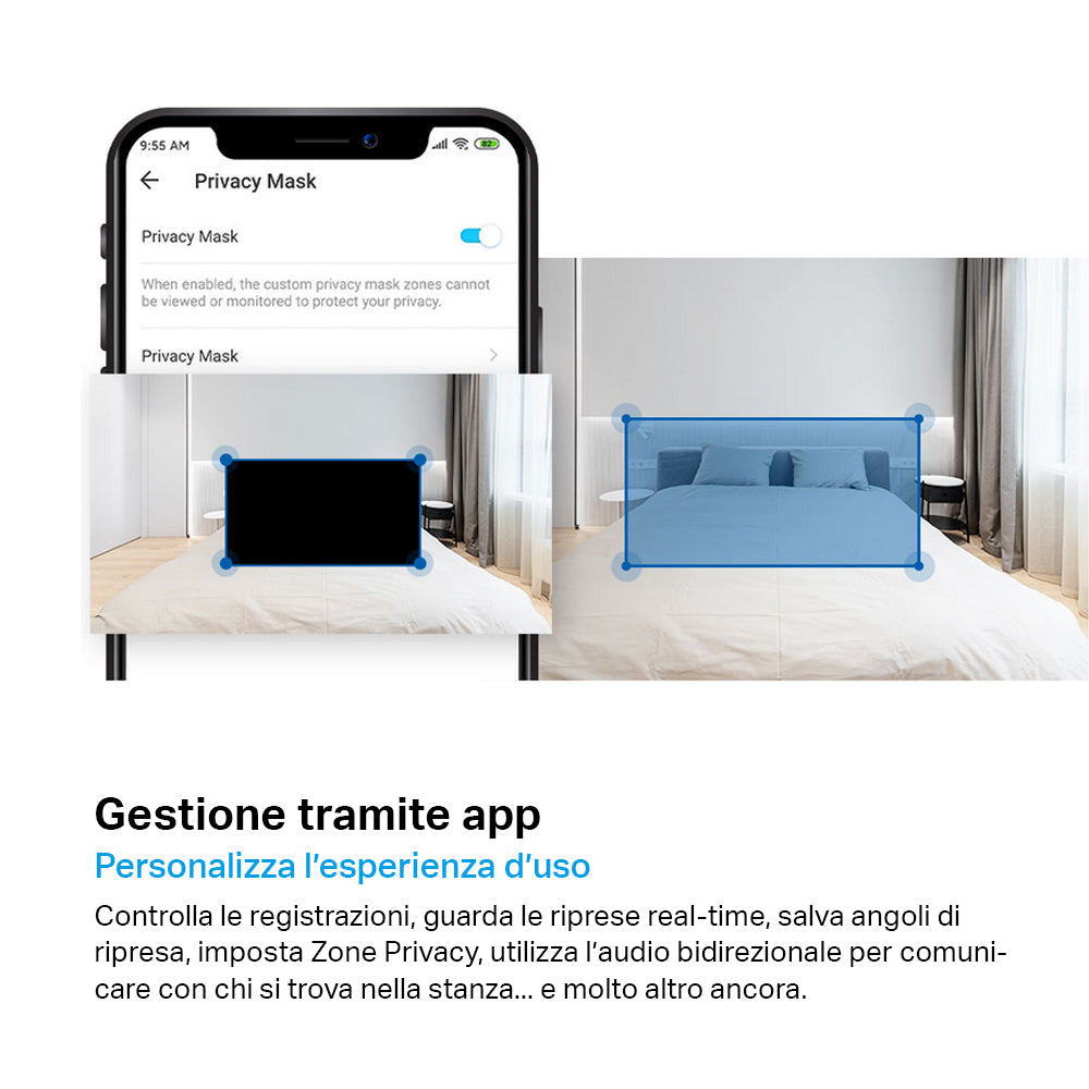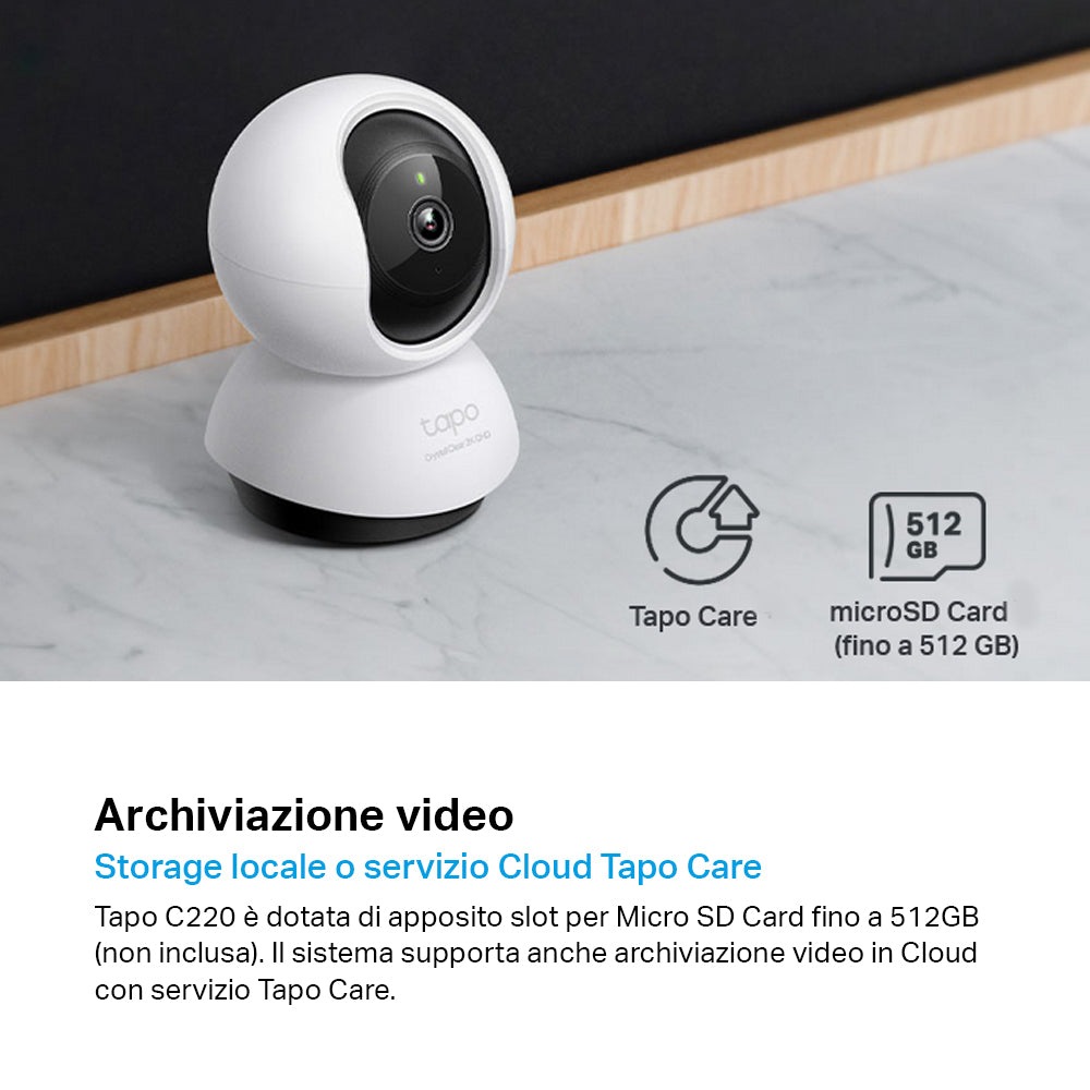 - ● Opzioni di archiviazione - Storage locale su MicroSD card fino a 512 GB (non inclusa), o in Cloud con servizio TapoCare.
