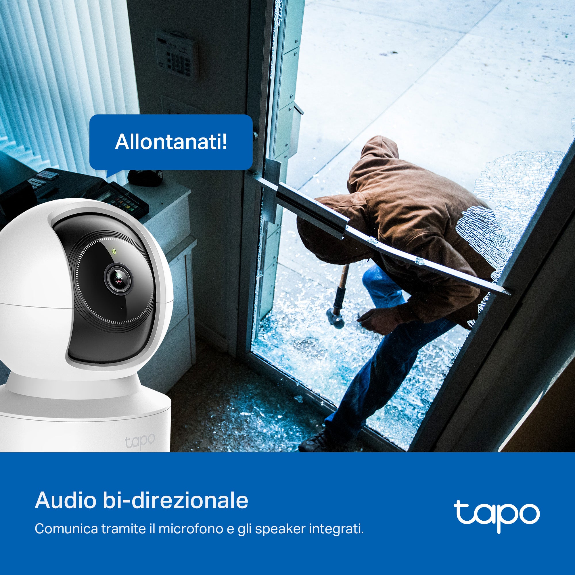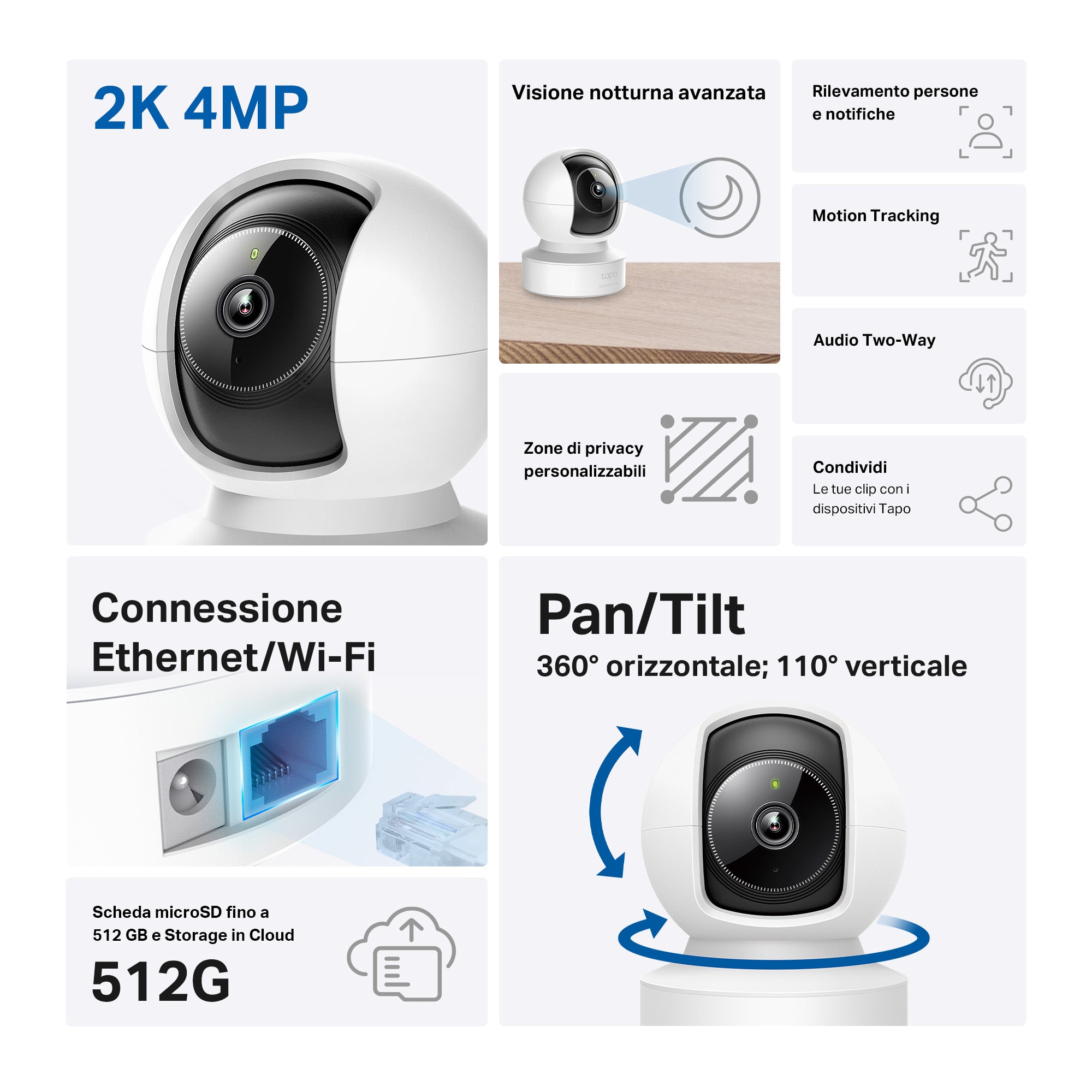 - ● Opzioni di archiviazione - Storage locale su MicroSD card fino a 512 GB (non inclusa), o in Cloud con servizio TapoCare.