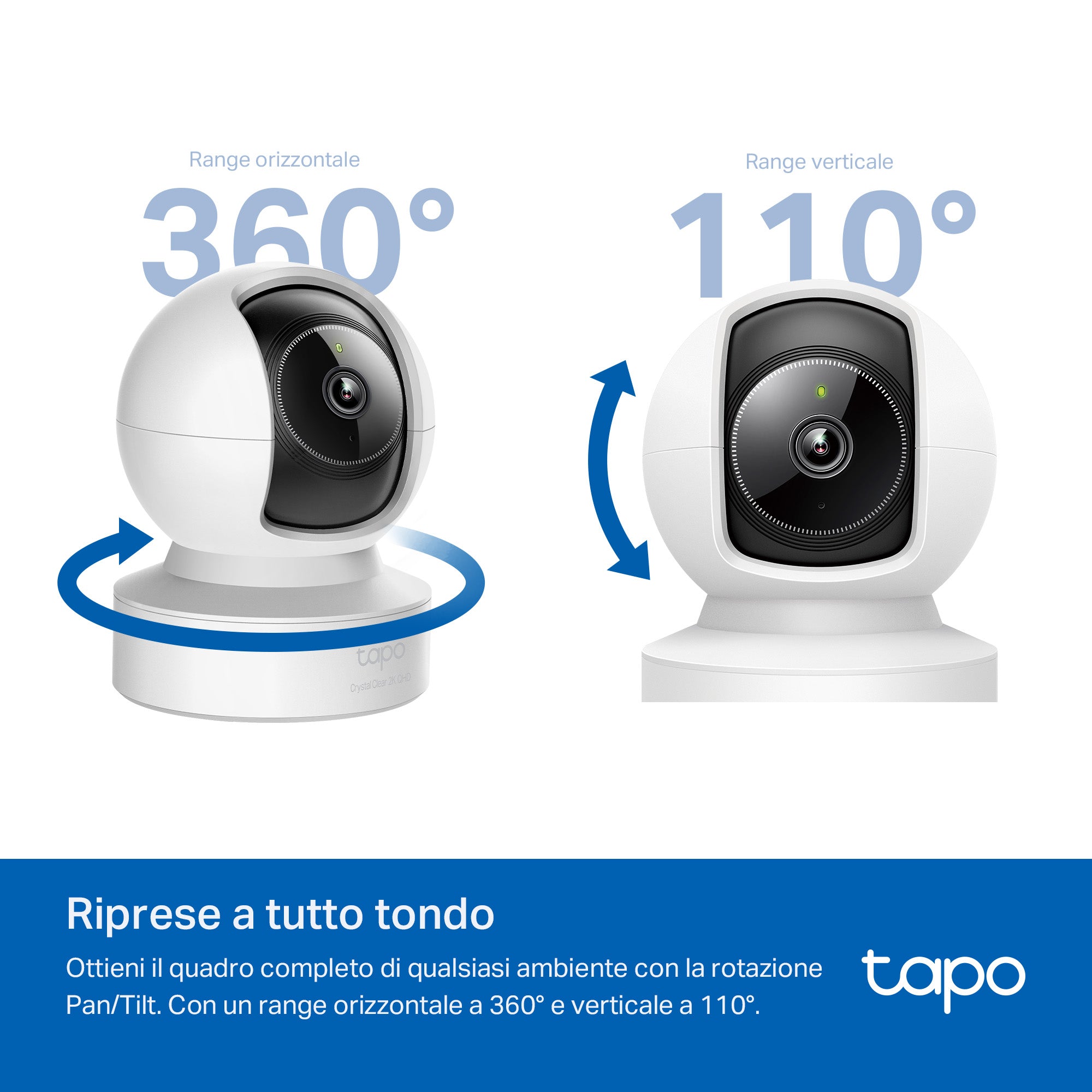 - ● Rotazione pan/tilt - Controlla ogni angolo della stanza grazie alla rotazione 360º orizzontale e 110º verticale.
