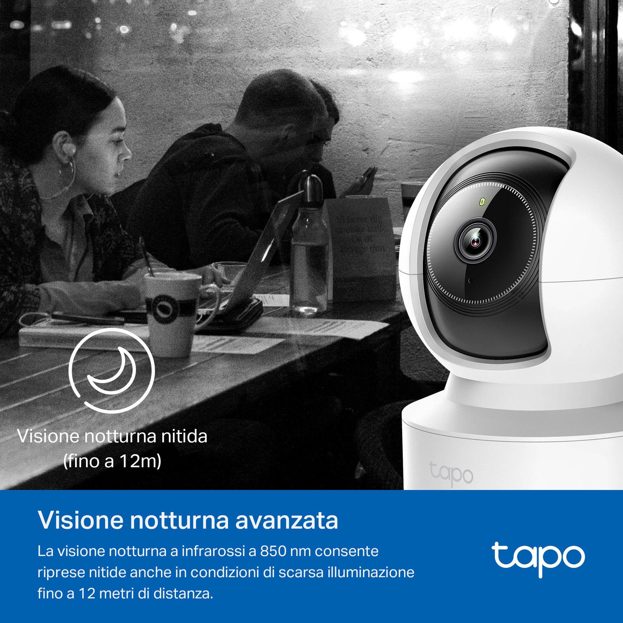 - ● Visione notturna avanzata - Osserva la scena con chiarezza fino a 12 metri anche in condizioni di scarsa luminosità.
