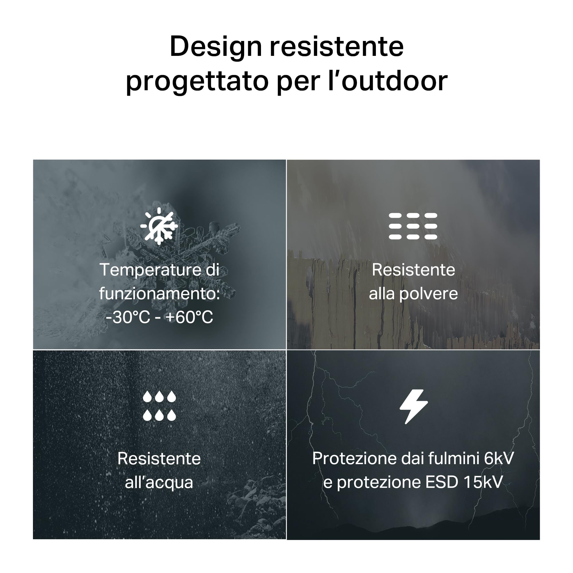 - ● Progettato per l’uso outdoor - Struttura resistente con certificazione IP65, protezione contro fulmini (±6 kV) ed ESD (±15 kV), per un funzionamento affidabile in ambienti esterni.