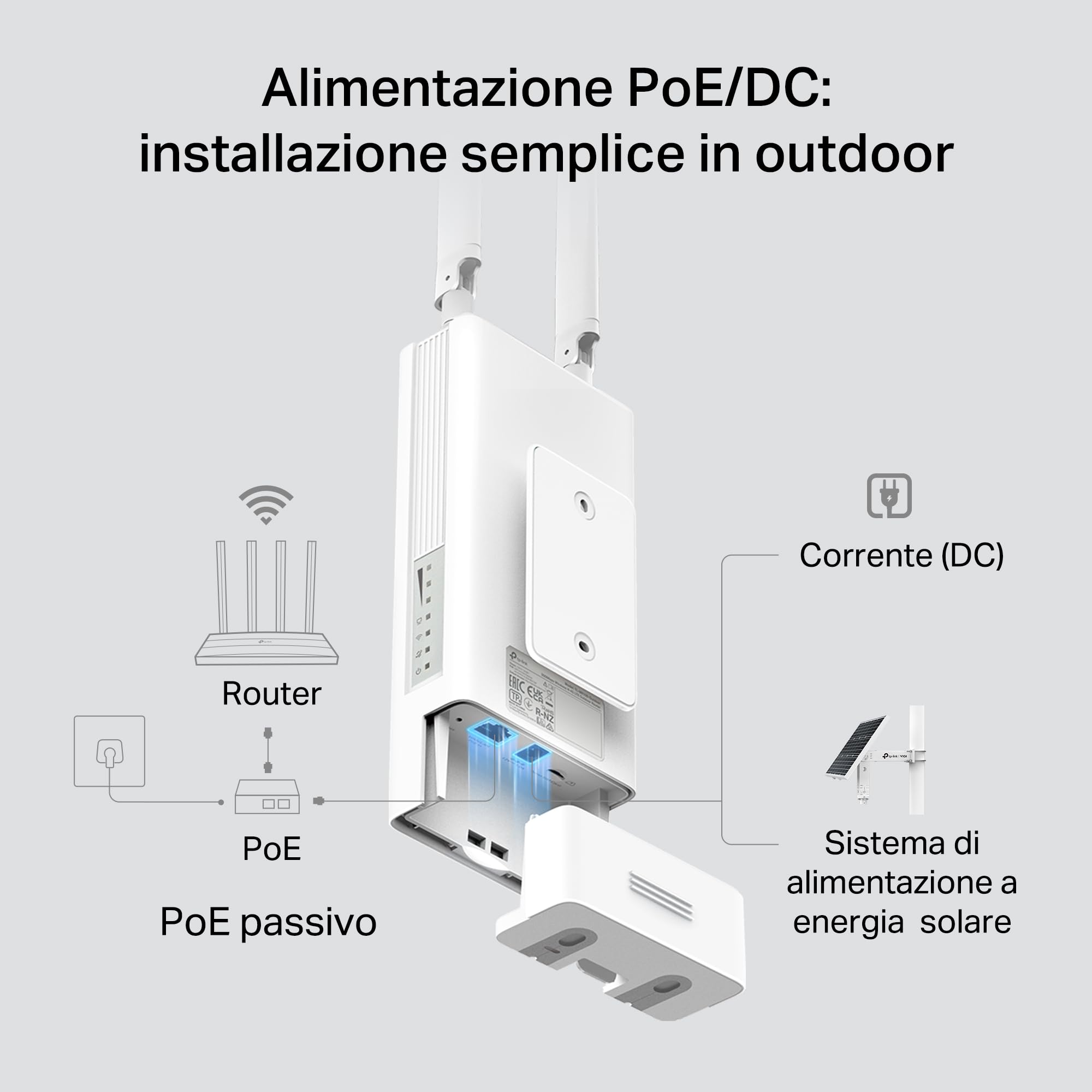 - ● Alimentazione PoE o DC - Compatibile con PoE 802.3af/802.3at e alimentazione DC, per una maggiore flessibilità di installazione.