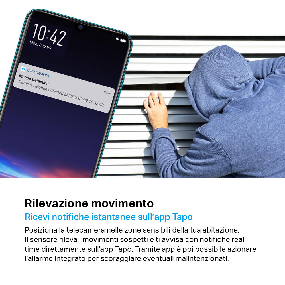 • Rilevazione movimento - Ricevi istantaneamente notifiche push quando viene intercettato un movimento.