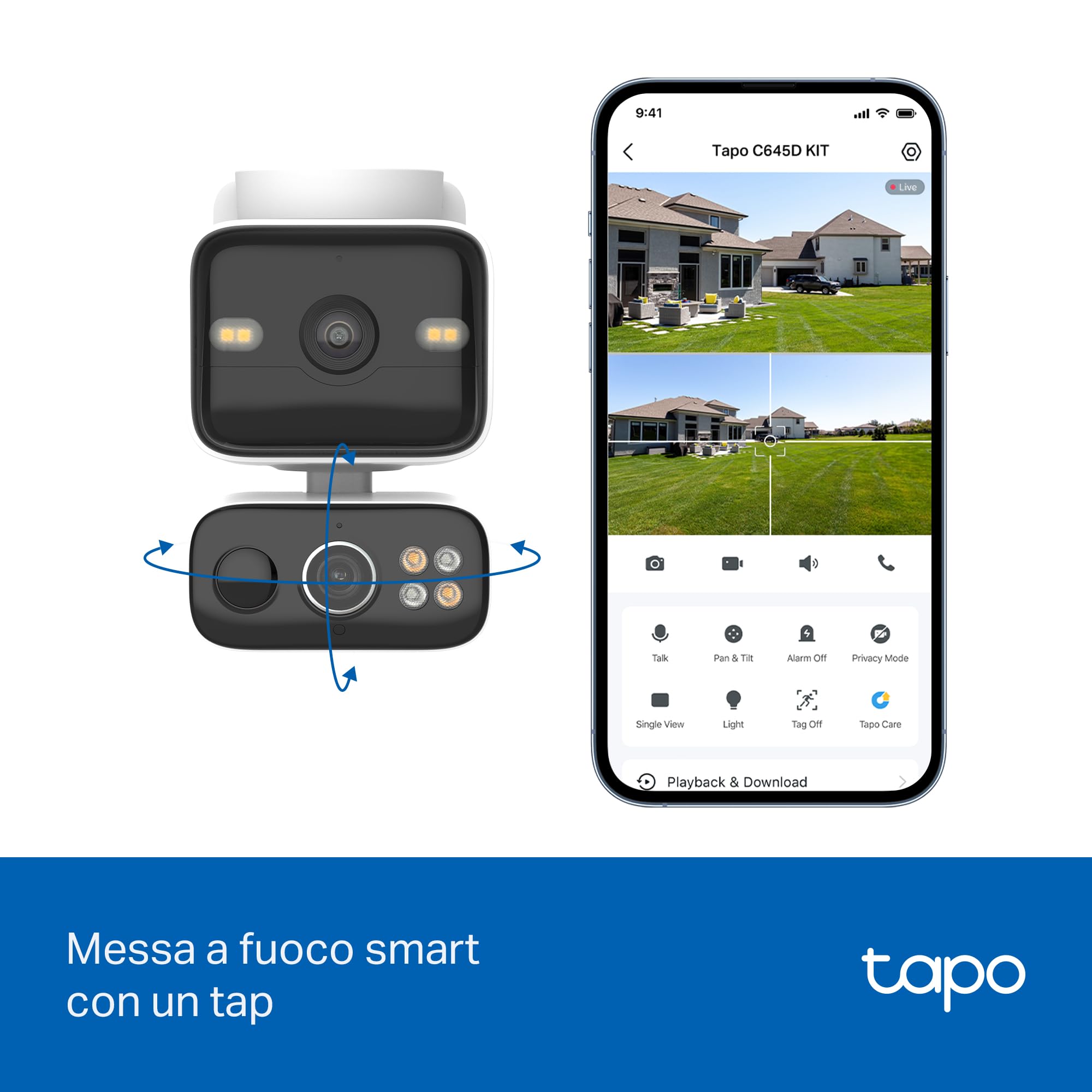 - ● Tracciamento intelligente sincronizzato - Quando attivato nell’app Tapo, l’obiettivo pan/tilt segue automaticamente il movimento rilevato dalla telecamera fissa, garantendo una sorveglianza continua e completa.
