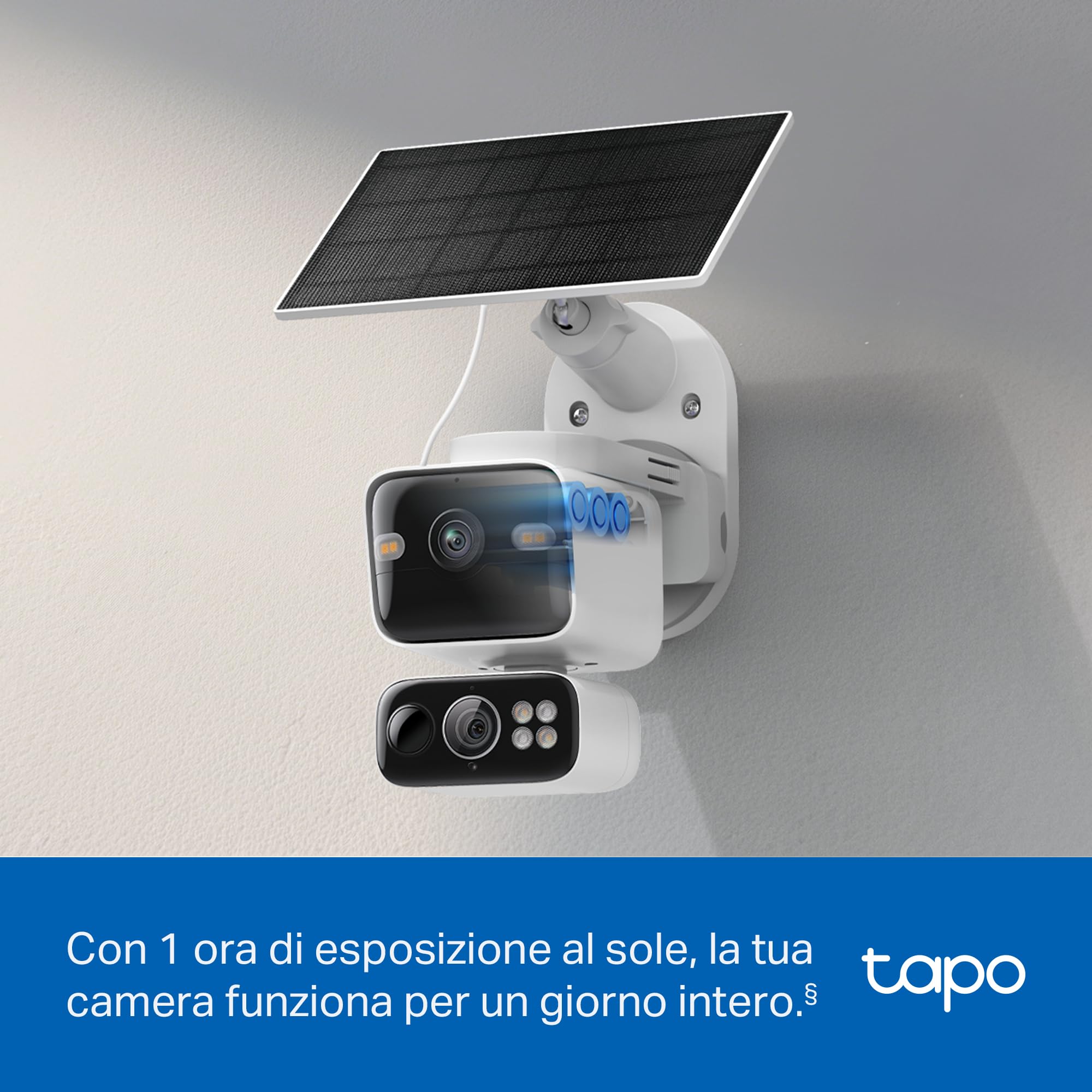 Tapo C645D KIT Telecamera Wifi Esterno con Pannello Solare, Doppia lente 2K, 360° Copre 2 aree insieme, Batteria di backup 10.000 mAh, Visione Notturna a Colori, Tracciamento/Rilevamento AI,IP65