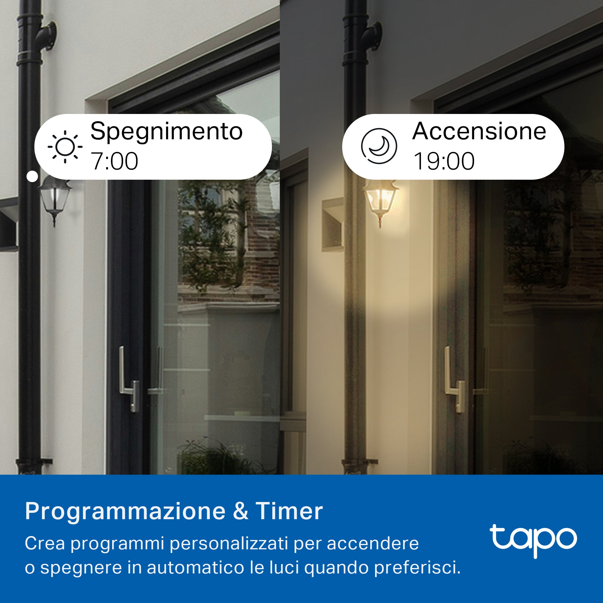 - ● Programmazione e timer - crea una programmazione regolare per accendere/spegnere la luce esterna del portico con gli effetti luminosi che preferisci.