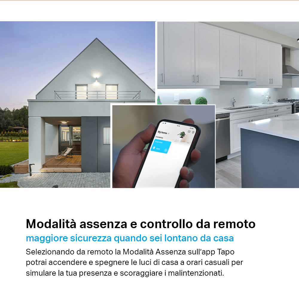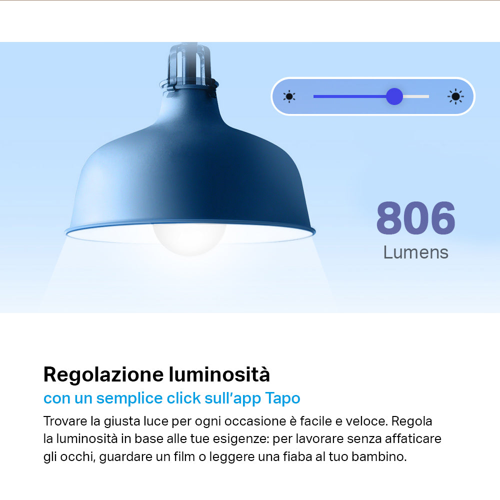 - ● Controllo da remoto – L'app Tapo ti permette di controllare da remoto accensione e spegnimento della lampadina smart.