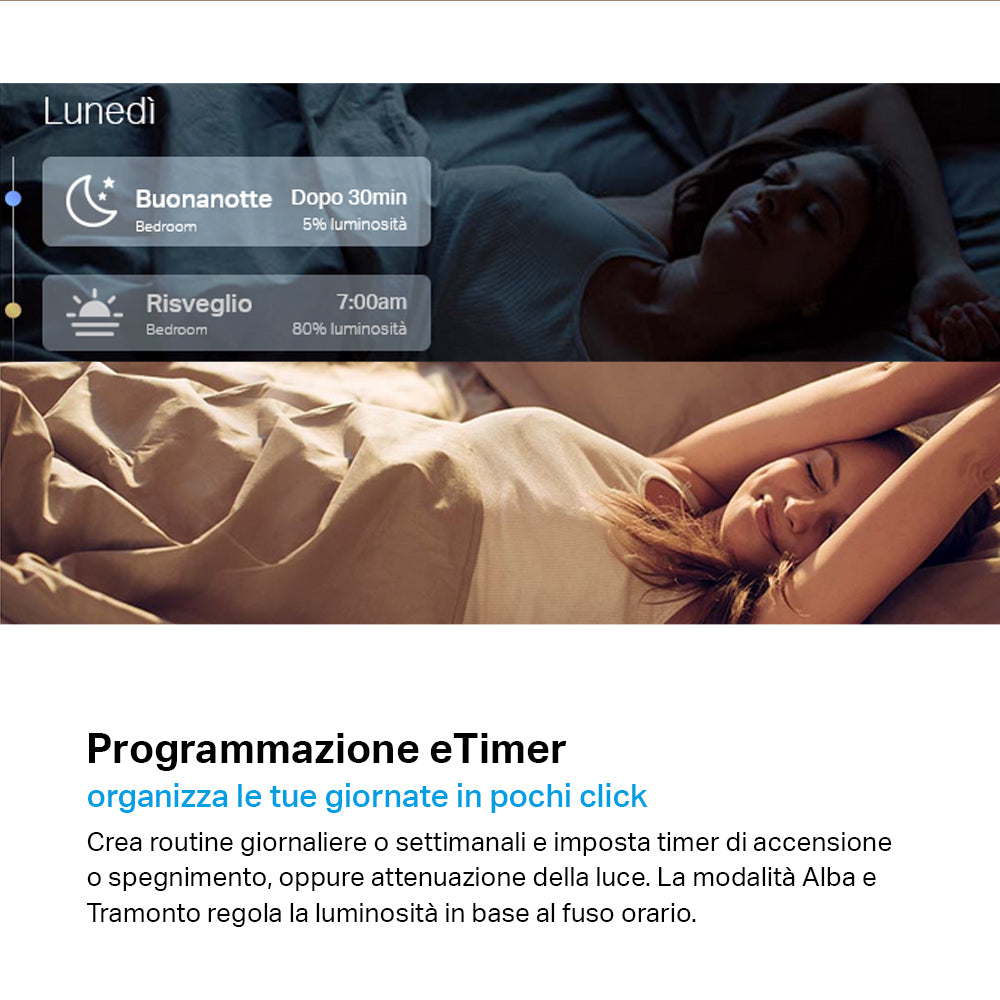 - ● Modalità Alba e Tramonto – Consente l'accensione e spegnimento automatico della lampadina in base al tuo fuso orario.