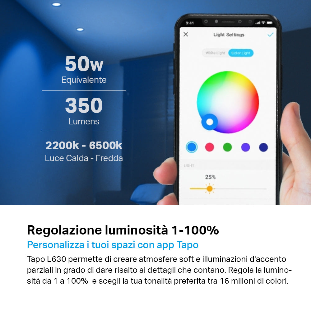 - ● Bianco regolabile - Imposta la temperatura colore tra 2,200 K e 6,500 K in base alle tue esigenze.