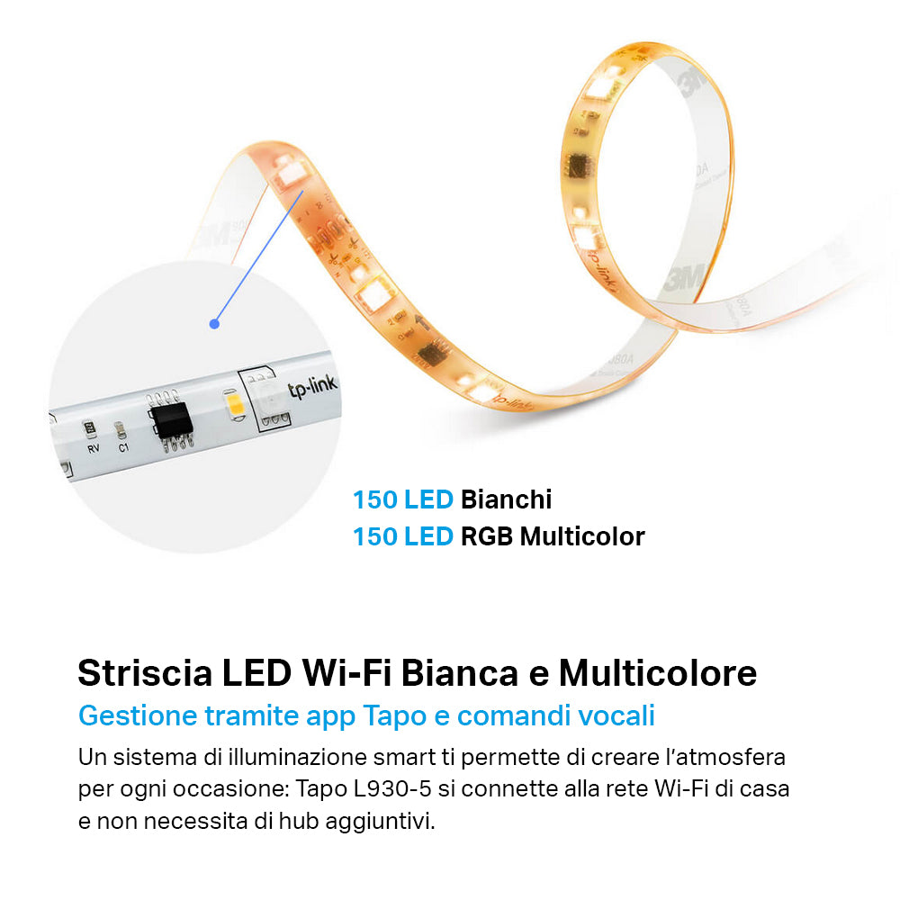 - ● Installazione facile - fissa la striscia luminosa con l’adesivo 3M dove desideri, connettila al Wi-Fi e configurala tramite l’app Tapo.